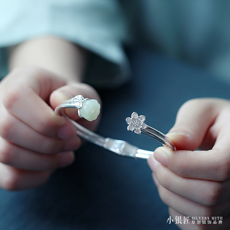 925 sterling silver inlaid natural hetian jade bracelet female hand-carved lotus flower retro temperament open bracelet bracelet jewelry